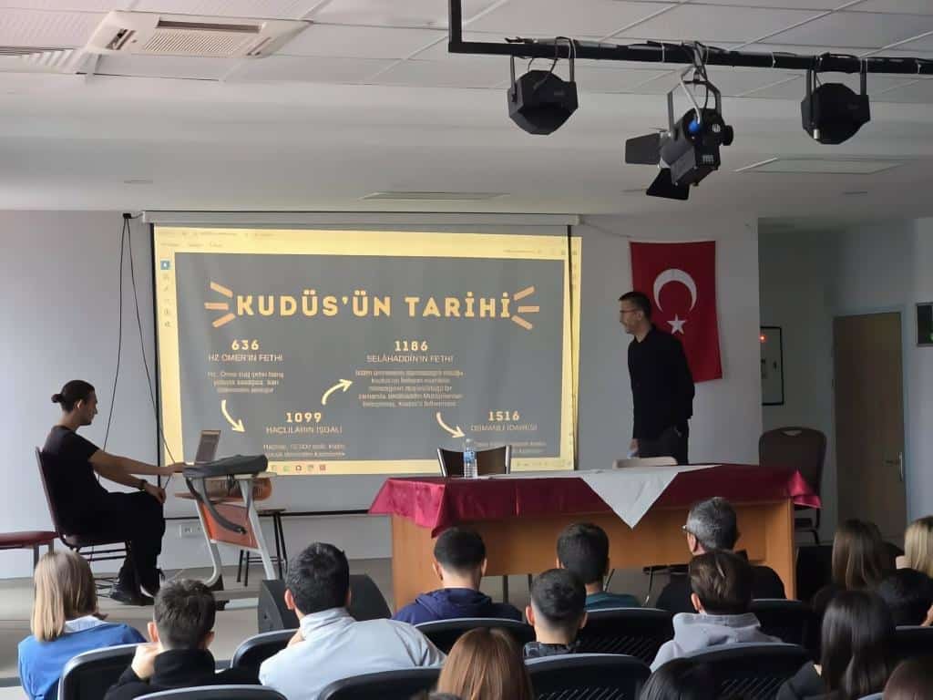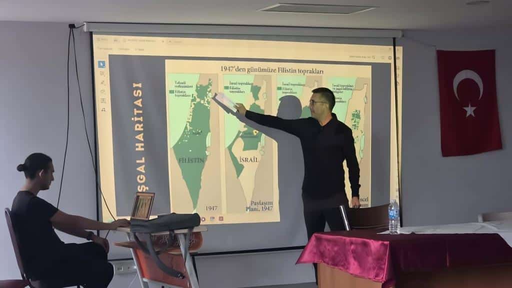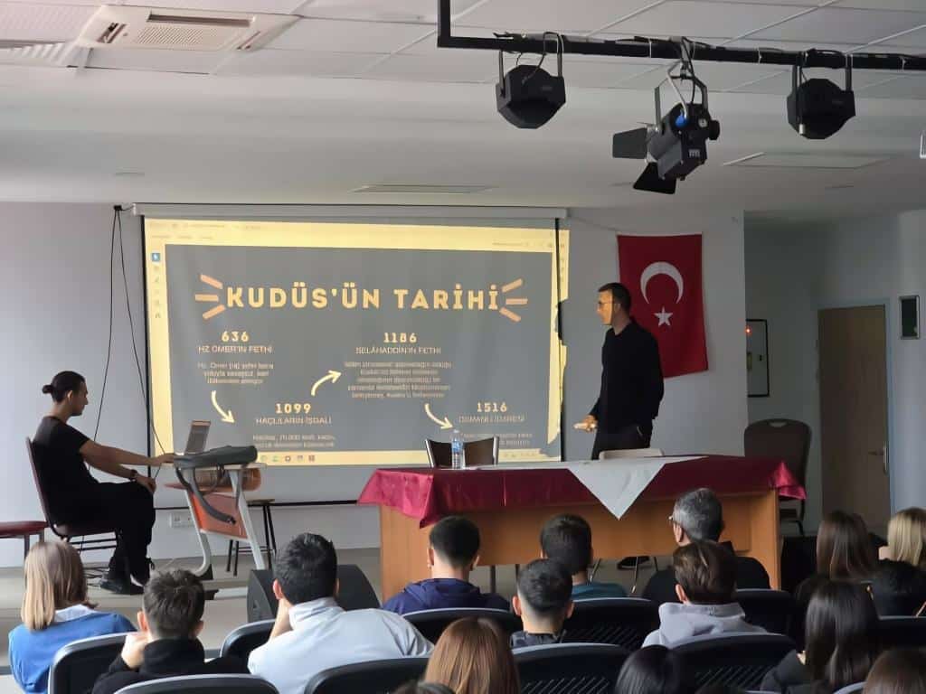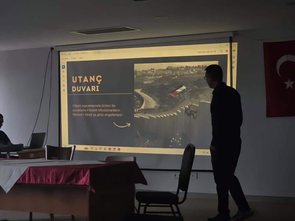 Sunumlar sırasında Filistin’in tarihî ve güncel durumu hakkında bilgiler paylaşıldı, ardından barış ve insan hakları temalı kısa videolar izlendi. Katılımcılar, Filistin halkına destek mesajlarını dile getirerek dayanışma duygusunu güçlendirdi.